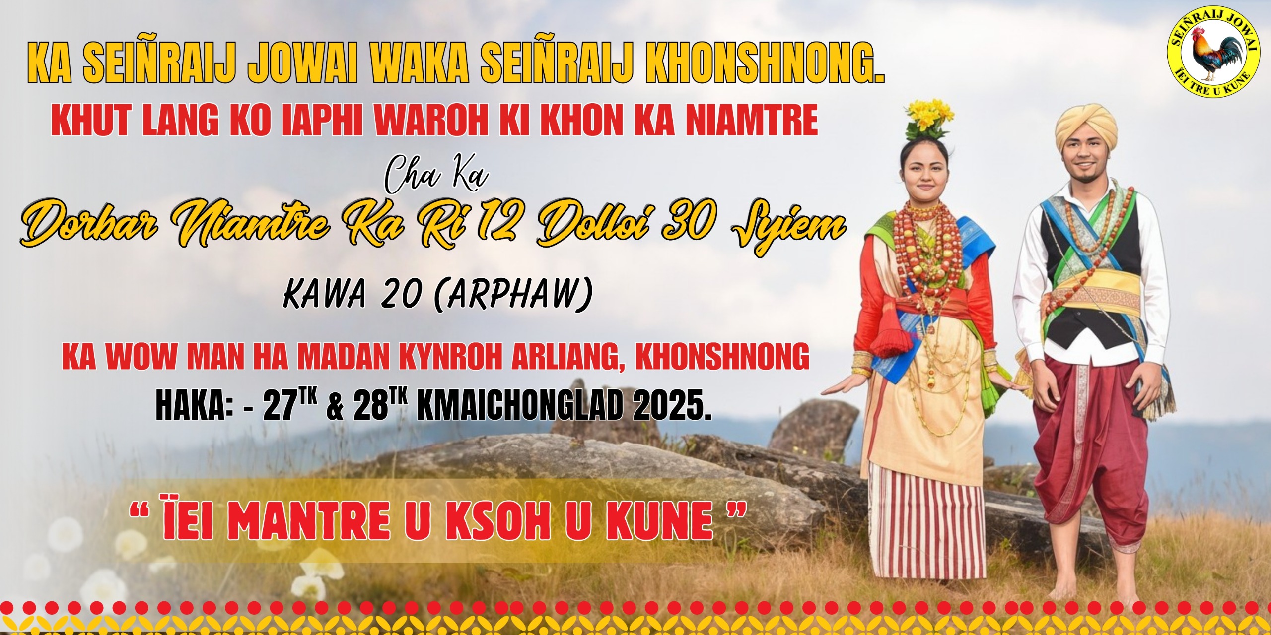 Seiñraij Jowai is a socio-cultural and religious organization rooted in the heart of Jowai, West Jaintia Hills District of Meghalaya. With its headquarters situated at Loompyrdi Iongpiah, this organization plays a vital role in safeguarding the cultural heritage, traditions, and spiritual beliefs of the Pnar people. Established with a deep sense of responsibility and vision, Seiñraij Jowai continues to stand as a pillar of unity, resilience, and identity for the community.
